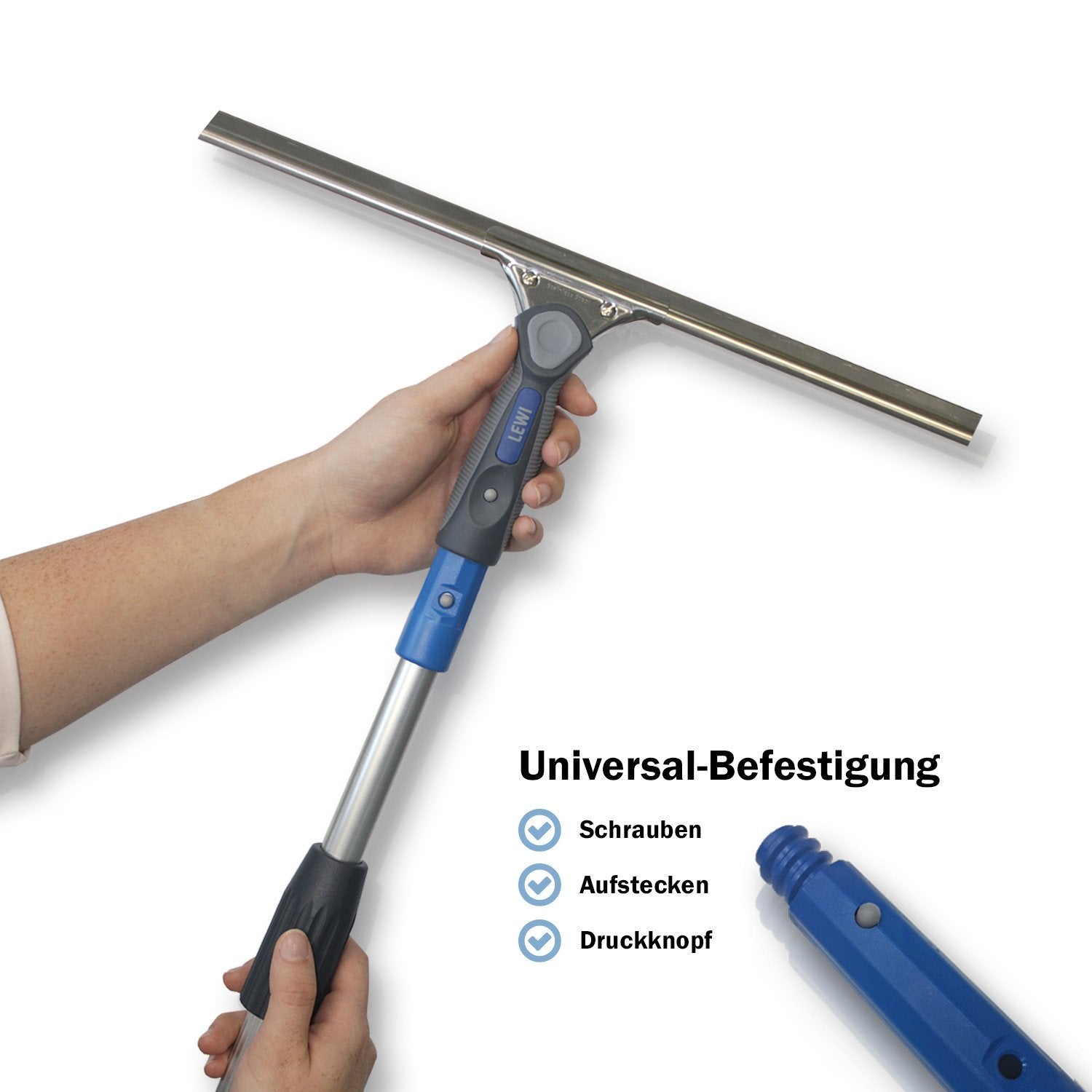 - Der Teleskopstiel kommt inklusive Universal-Befestigung / Konus für alle gängigen Handfensterwischer (zum Schrauben, Aufstecken oder per Druckknopf-Arretierung)